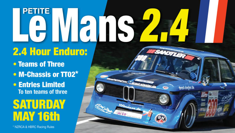 Teams of three. Must enter with a team name (keep it short for the voice-over)One driving, one marshalling, one pit crew. Each driver has their own car with an individual transponder. All three transponders are entered as a team. Cars can be either M-Chassis or TT02 (or a mixture of both). Cars must comply with HBRC Club class rules.